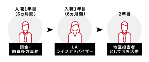 職員のスキルアップや効果的な研修の実施、人員配置、ジョブローテーションを実践する人財育成プログラム「城南信用金庫キャリアパス」を整備しています。キャリアパスにおいては、「全員営業体制」の実現を目指し、入職以降段階を踏んで必要なスキルが身につく人事配置を行っています。